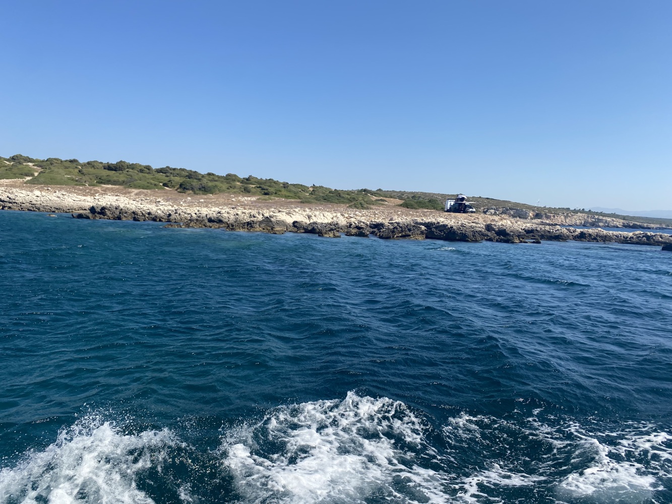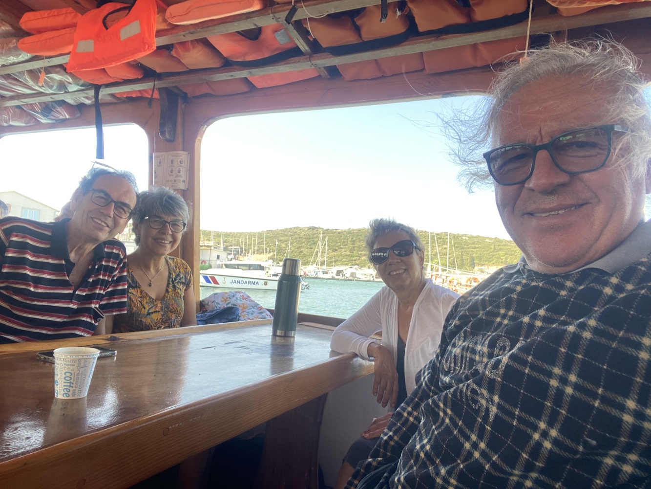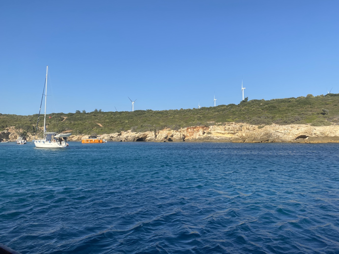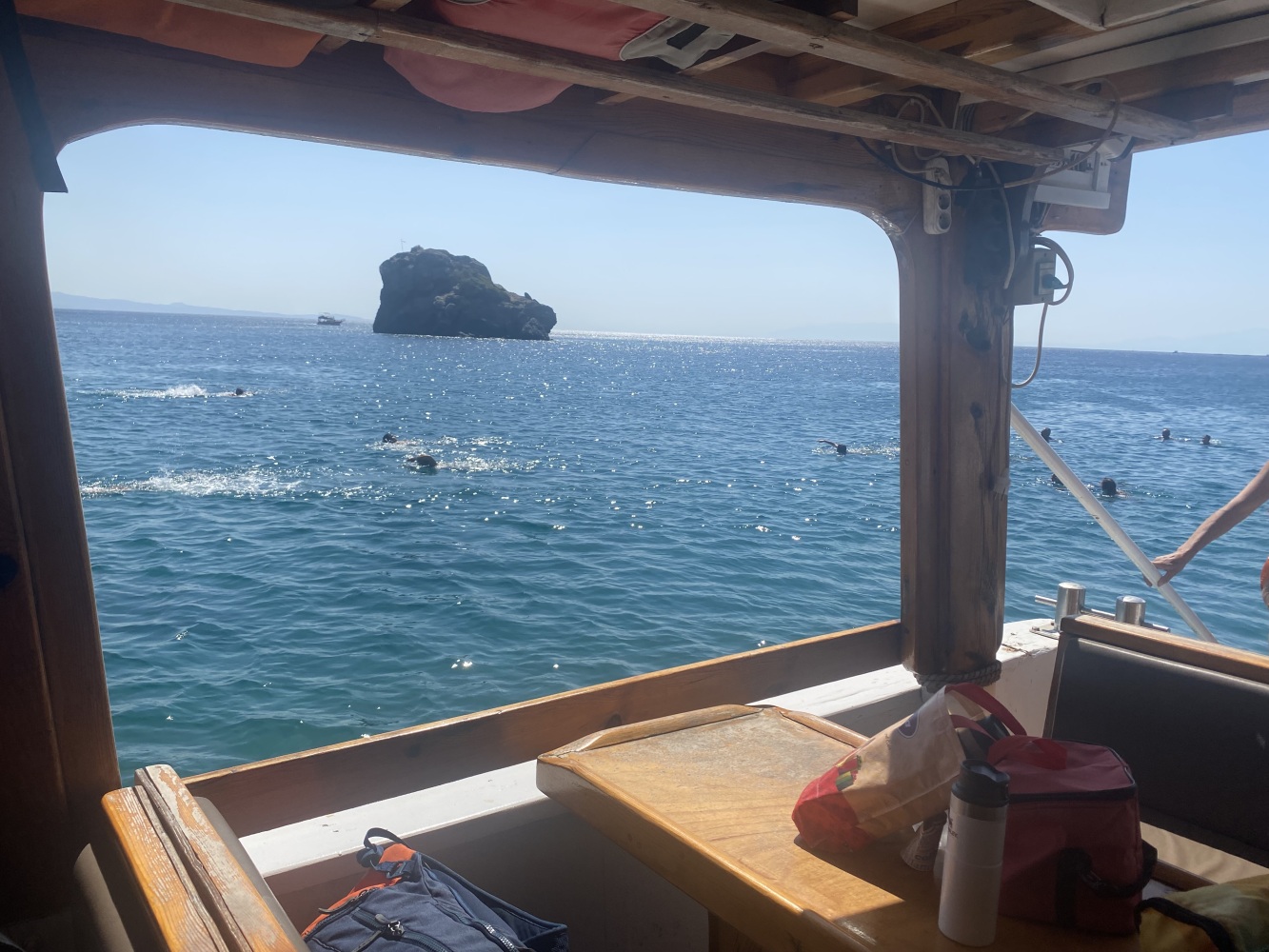 Rüzgar dalga fırtınayla kıyıya paralel kuzeybatı istikametinde uzun süre yolladık. Öğle molası vereceğimiz Demircili plajlarına yakın bir defa yüzme molası verdik. Menüden uskumru ızgara seçtiğimiz ikram molasında 2 saat kıyıda kaldığımızda bu defa ben de yüzdüm. Sonrasında geldiğimiz Yağcılar kıyısında da yüzdük. Dönüşte Sığacık’tan yakın Akvaryum plajında ise bizim ekip seyretmeyi tercih ettik.