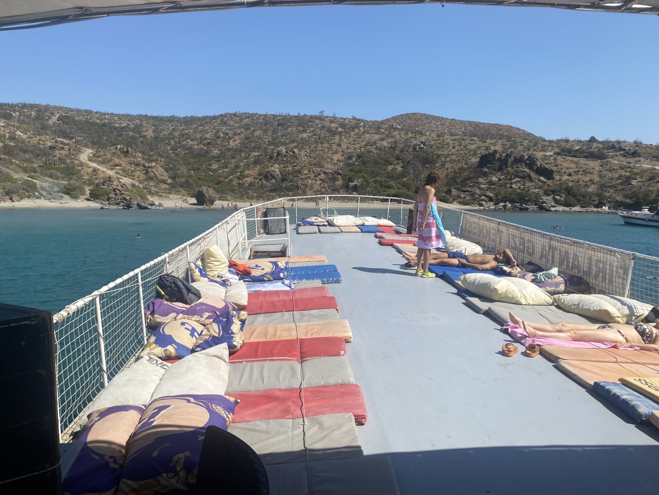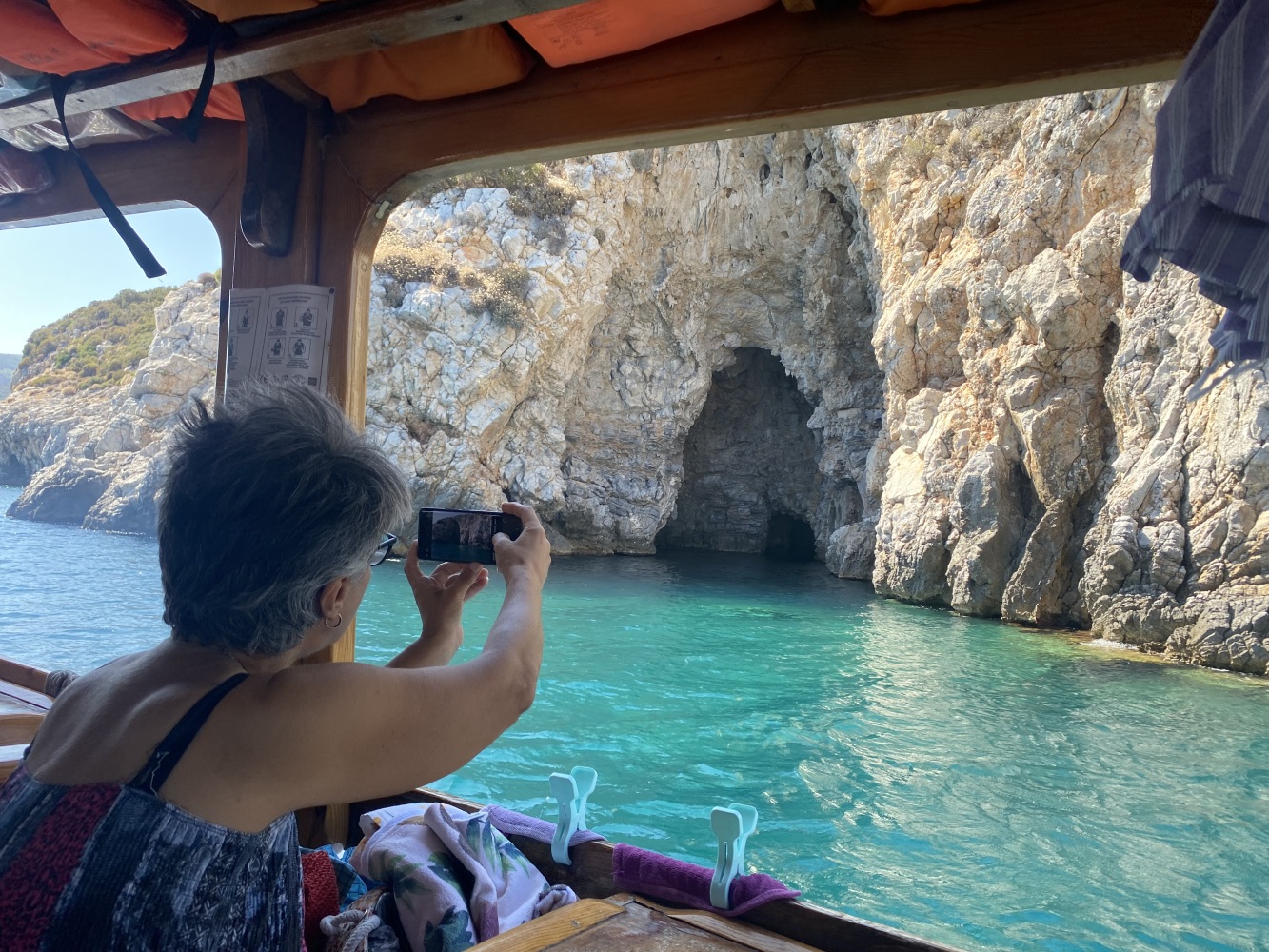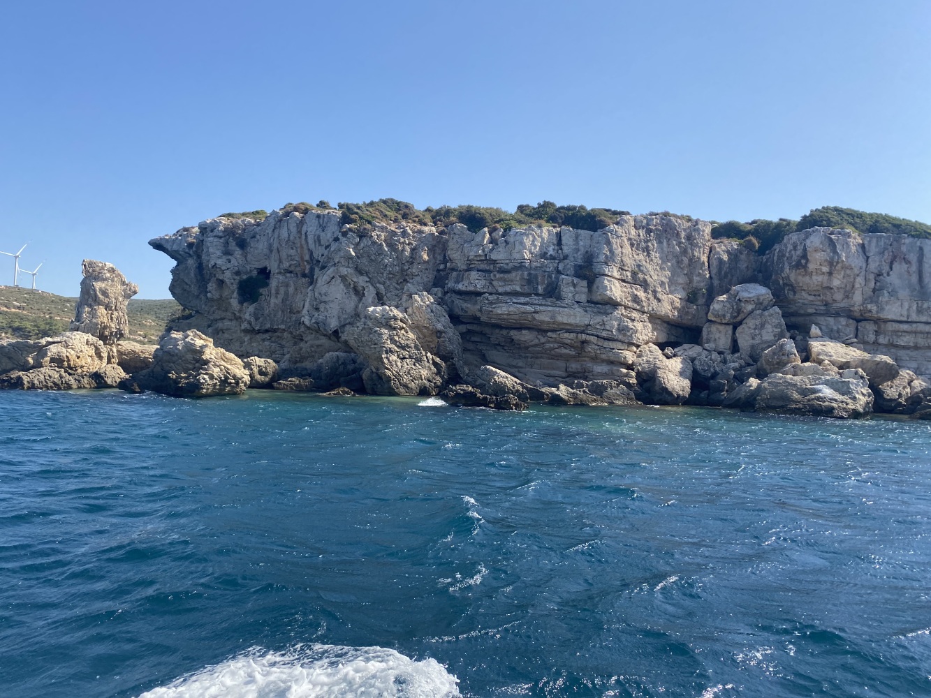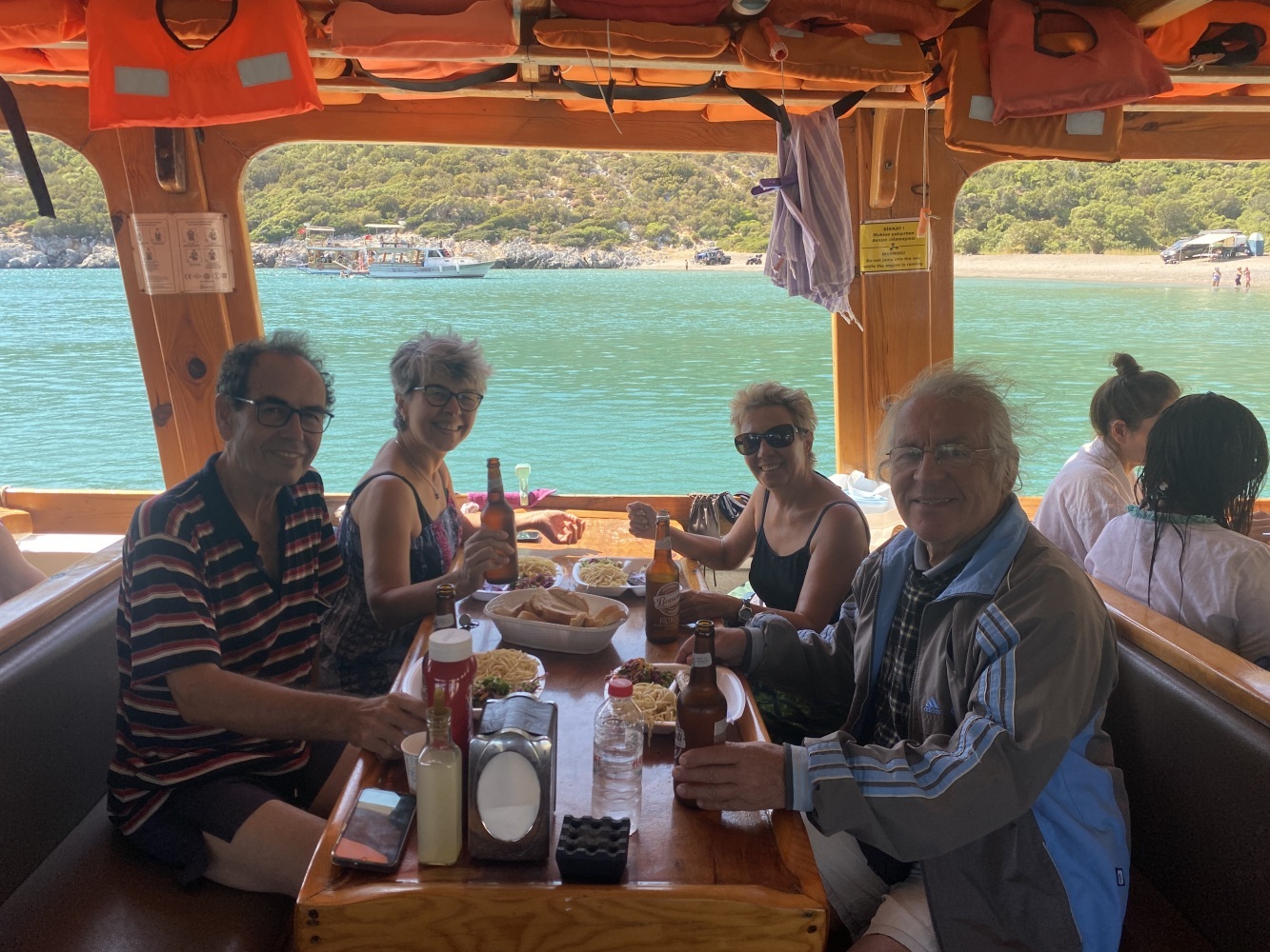 Rüzgar dalga fırtınayla kıyıya paralel kuzeybatı istikametinde uzun süre yolladık. Öğle molası vereceğimiz Demircili plajlarına yakın bir defa yüzme molası verdik. Menüden uskumru ızgara seçtiğimiz ikram molasında 2 saat kıyıda kaldığımızda bu defa ben de yüzdüm. Sonrasında geldiğimiz Yağcılar kıyısında da yüzdük. Dönüşte Sığacık’tan yakın Akvaryum plajında ise bizim ekip seyretmeyi tercih ettik.