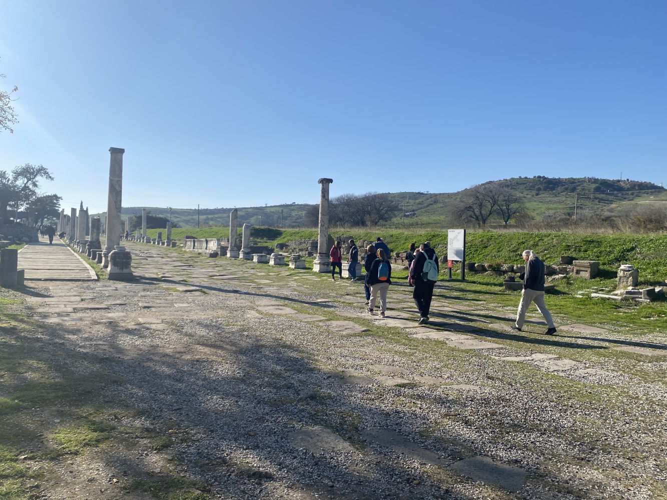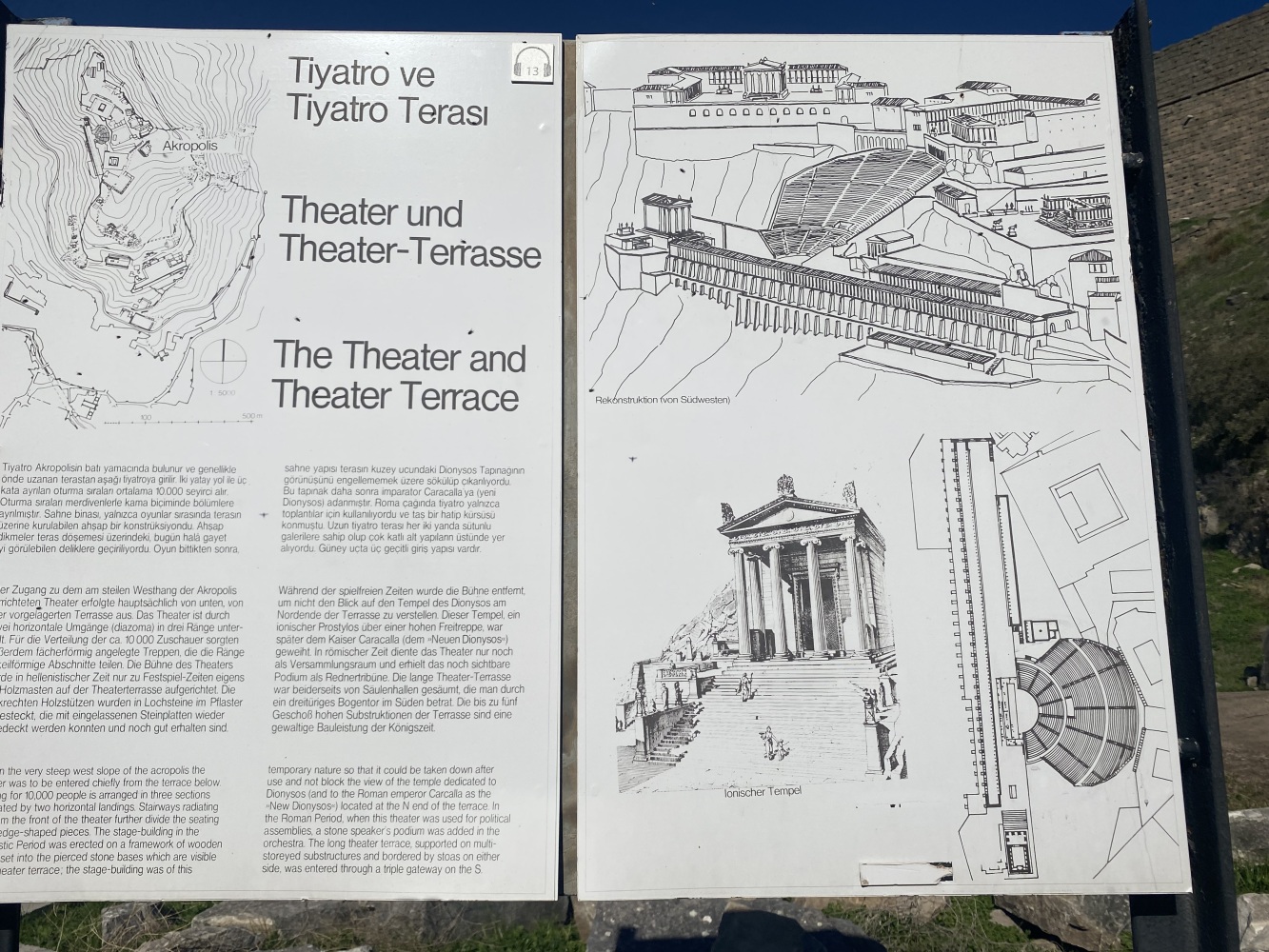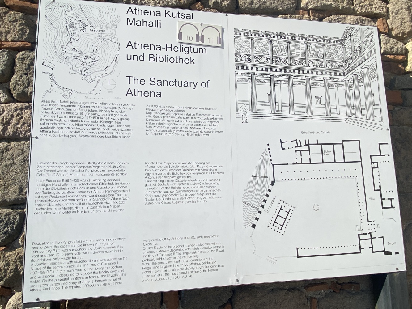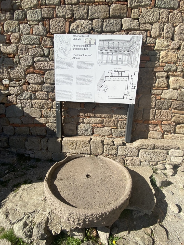 Öncelikle rehbersiz gezmek zor. Nereden başlayıp nereden devam edeceğini kestirmek kolay değil. Levhalarda şehir planı var ama levhalar yetersiz. Bazı levhalar iyi okunmuyor ve bazılarını bulmak bile zor. Örneğin Athena Tapınağı bilgilendirme levhasını oldukça iyi saklamışlar. Belki de iyi bir ziyaret rotası çizemediğimizden yönlendirme oku ve bilgi levhasına rastlamadığımız için ünlü kütüphaneyi pas geçtikti. Alanda gördüğüm en güzel bilgilendirme levhası şöyle idi: Tiyatroya gider. Oysa Helenistik tiyatro heryerden gözüküyordu zaten. Dionysus tapınağının yanına kadar gittiğimiz halde bilgileridirme levhası yoktu. Tiyatro terasının devamındaki bazı önemli noktaları açıp ziyaretçilerin gezebilmesi için epeyce eziyet ediliyor. Arkadaşlarımız yılmadılar, uğraşıp açtırdılar.
