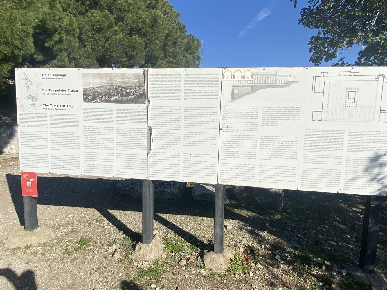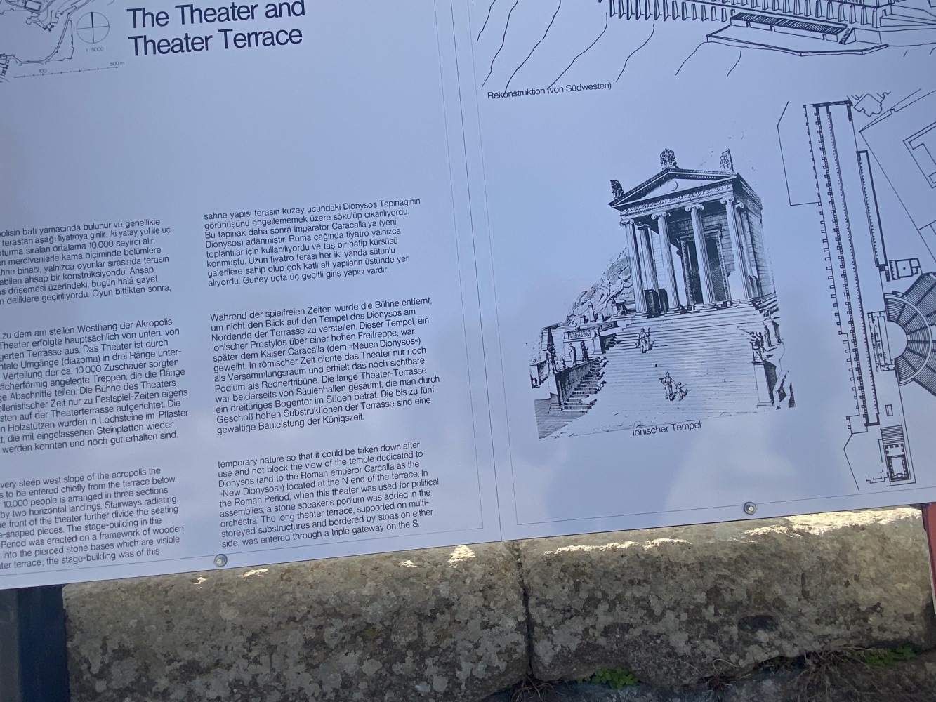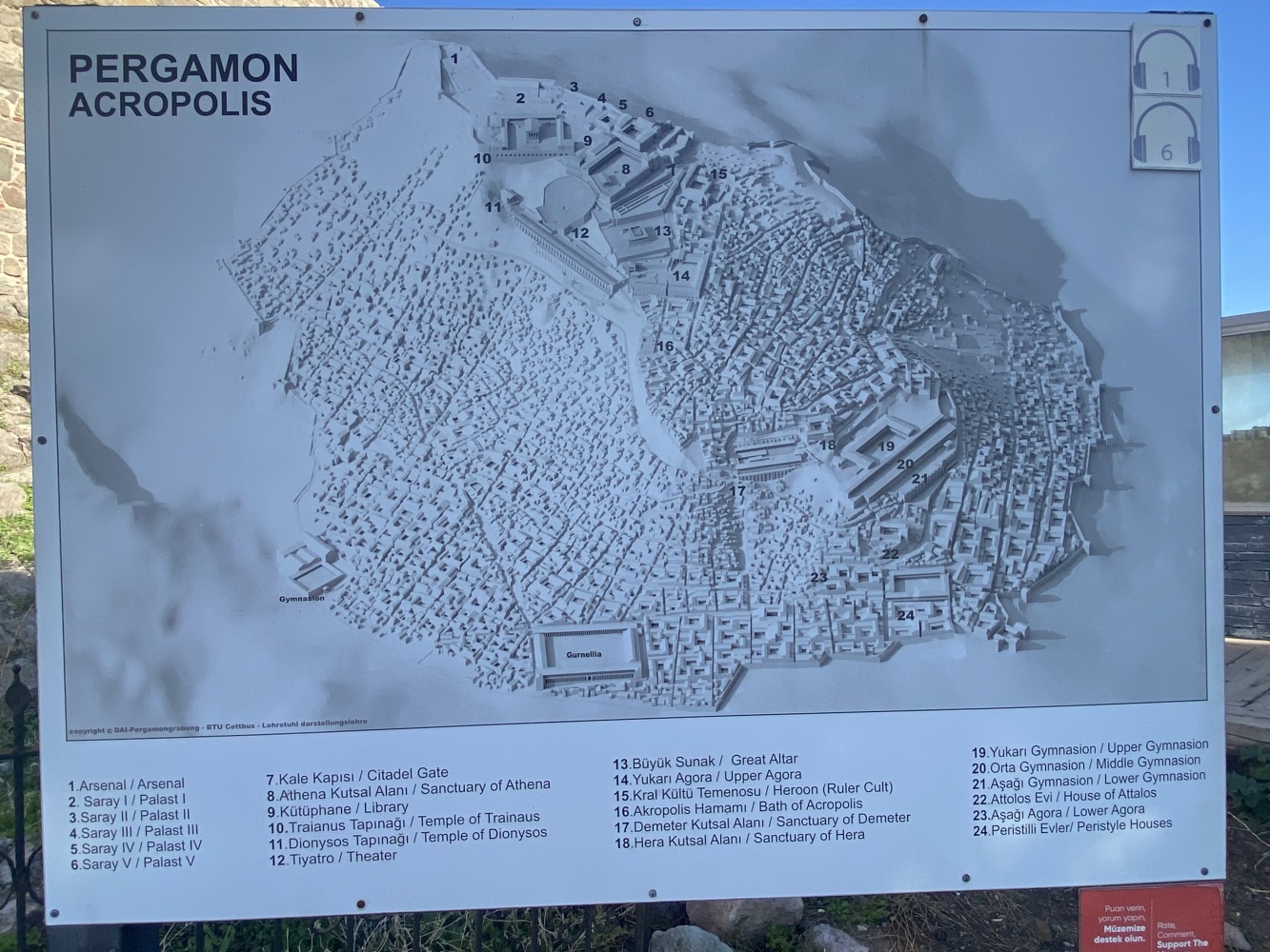 Öncelikle rehbersiz gezmek zor. Nereden başlayıp nereden devam edeceğini kestirmek kolay değil. Levhalarda şehir planı var ama levhalar yetersiz. Bazı levhalar iyi okunmuyor ve bazılarını bulmak bile zor. Örneğin Athena Tapınağı bilgilendirme levhasını oldukça iyi saklamışlar. Belki de iyi bir ziyaret rotası çizemediğimizden yönlendirme oku ve bilgi levhasına rastlamadığımız için ünlü kütüphaneyi pas geçtikti. Alanda gördüğüm en güzel bilgilendirme levhası şöyle idi: Tiyatroya gider. Oysa Helenistik tiyatro heryerden gözüküyordu zaten. Dionysus tapınağının yanına kadar gittiğimiz halde bilgileridirme levhası yoktu. Tiyatro terasının devamındaki bazı önemli noktaları açıp ziyaretçilerin gezebilmesi için epeyce eziyet ediliyor. Arkadaşlarımız yılmadılar, uğraşıp açtırdılar.