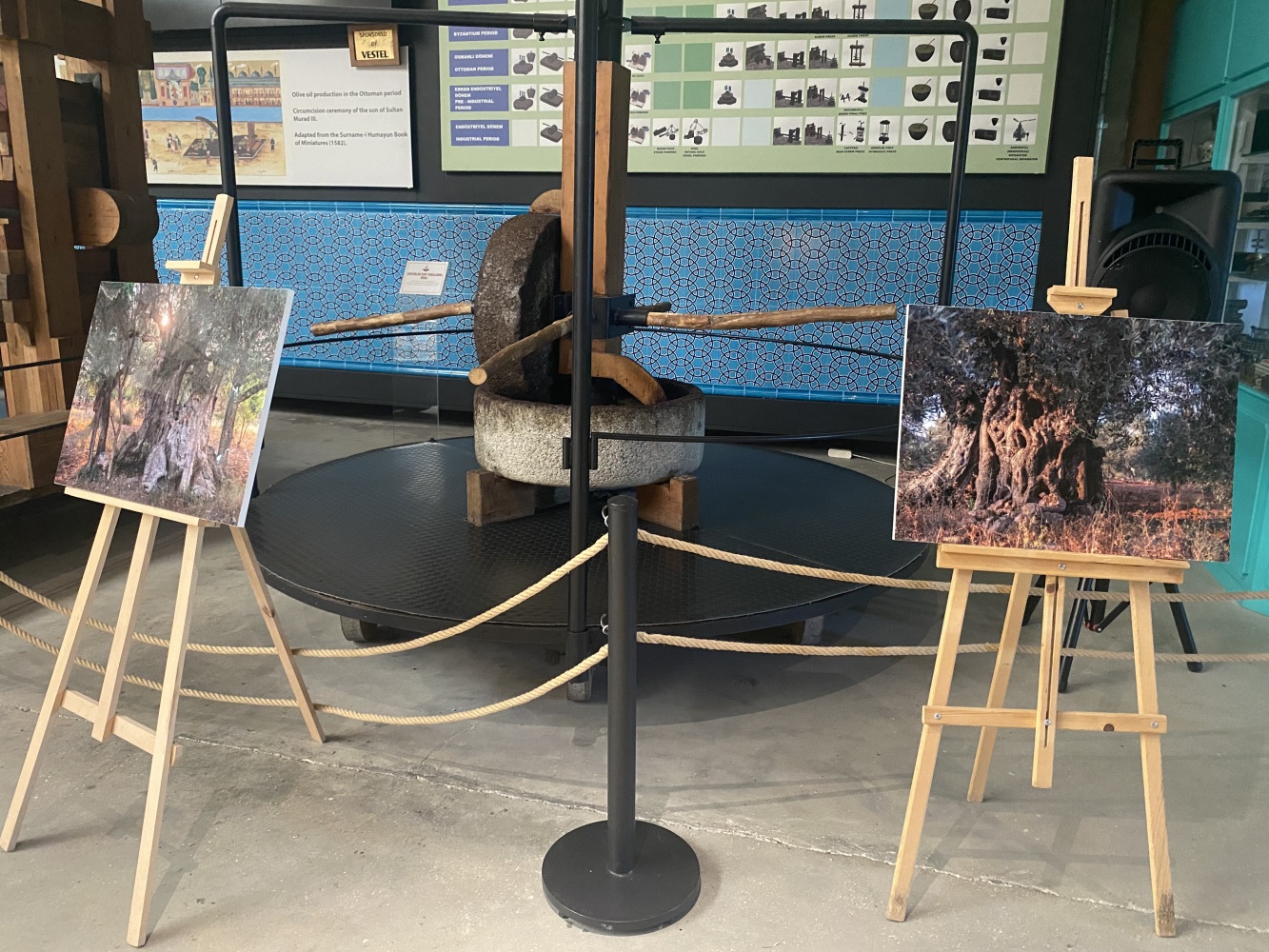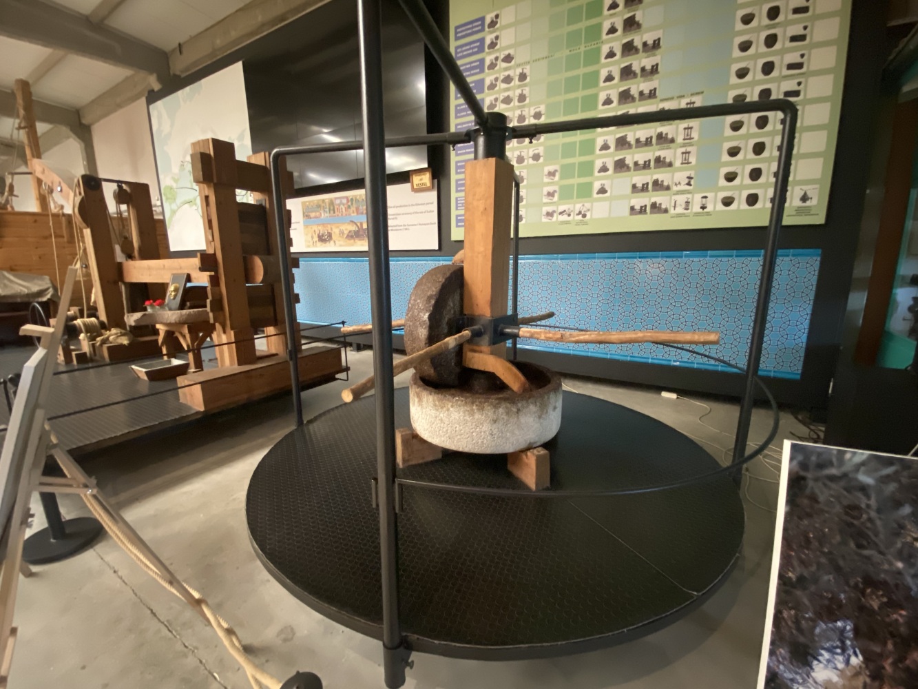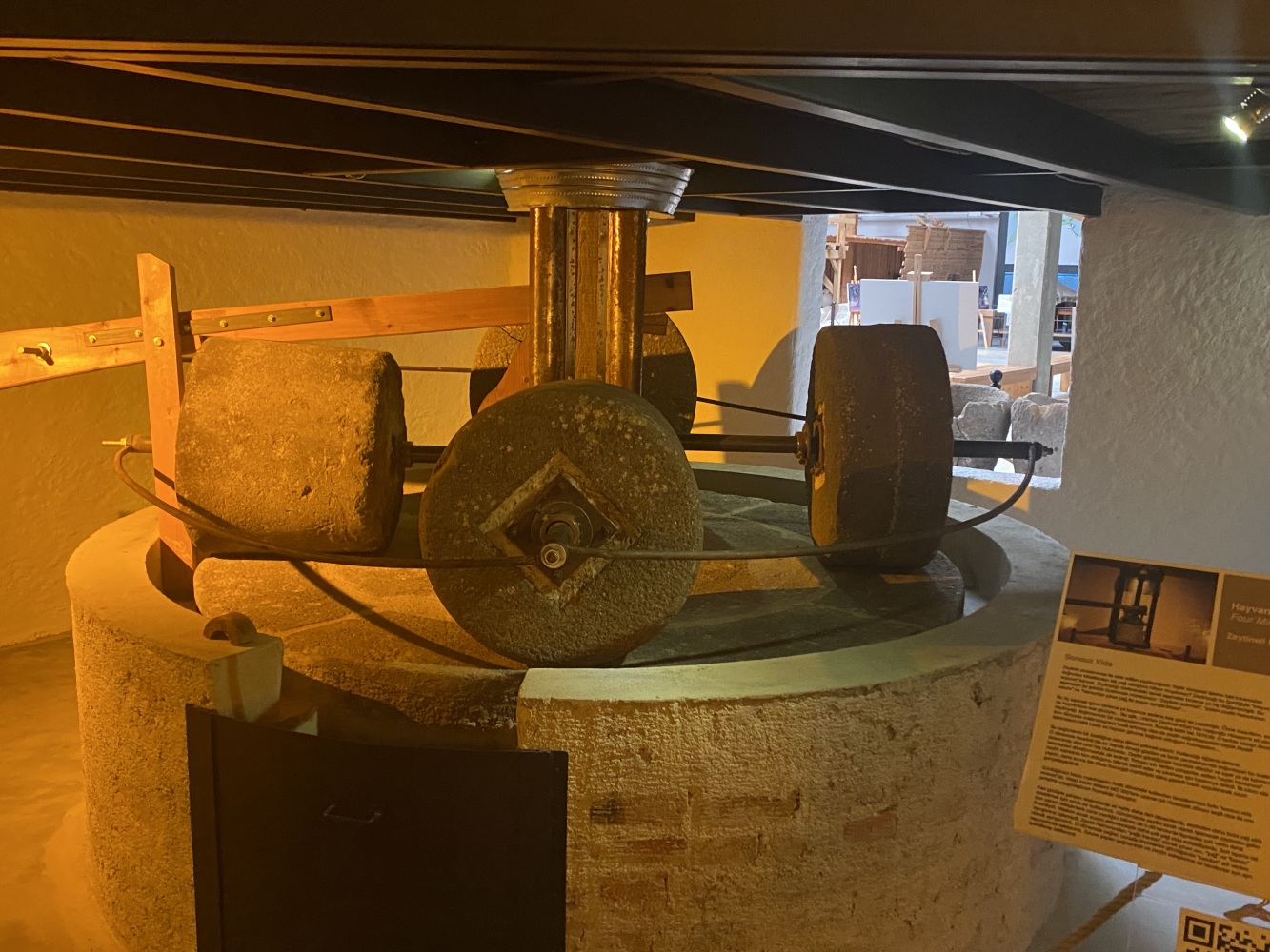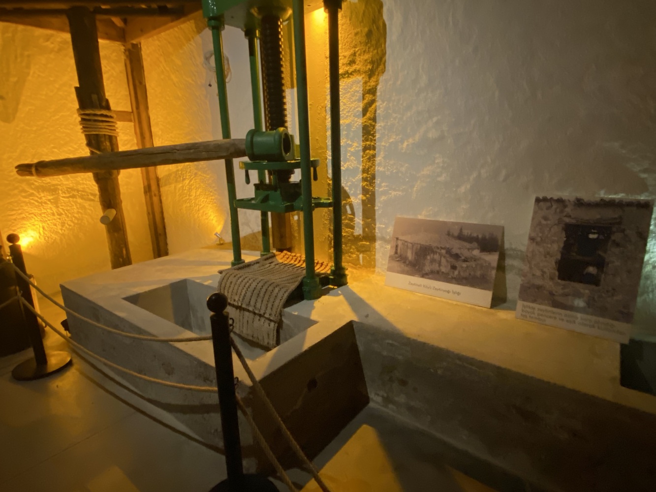 Gördüğünüz tüm mekanizma insan gücüyle çalışırdı. İlk işlem, zeytinin hamur haline getirilmesiiydi. Ahşap balkonun altındaki büyük ezme taşları, balkondaki kişiler tarafından döndürülür ve taşların altındaki zeytinler bu şekilde ezilirdi.