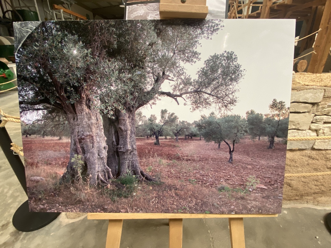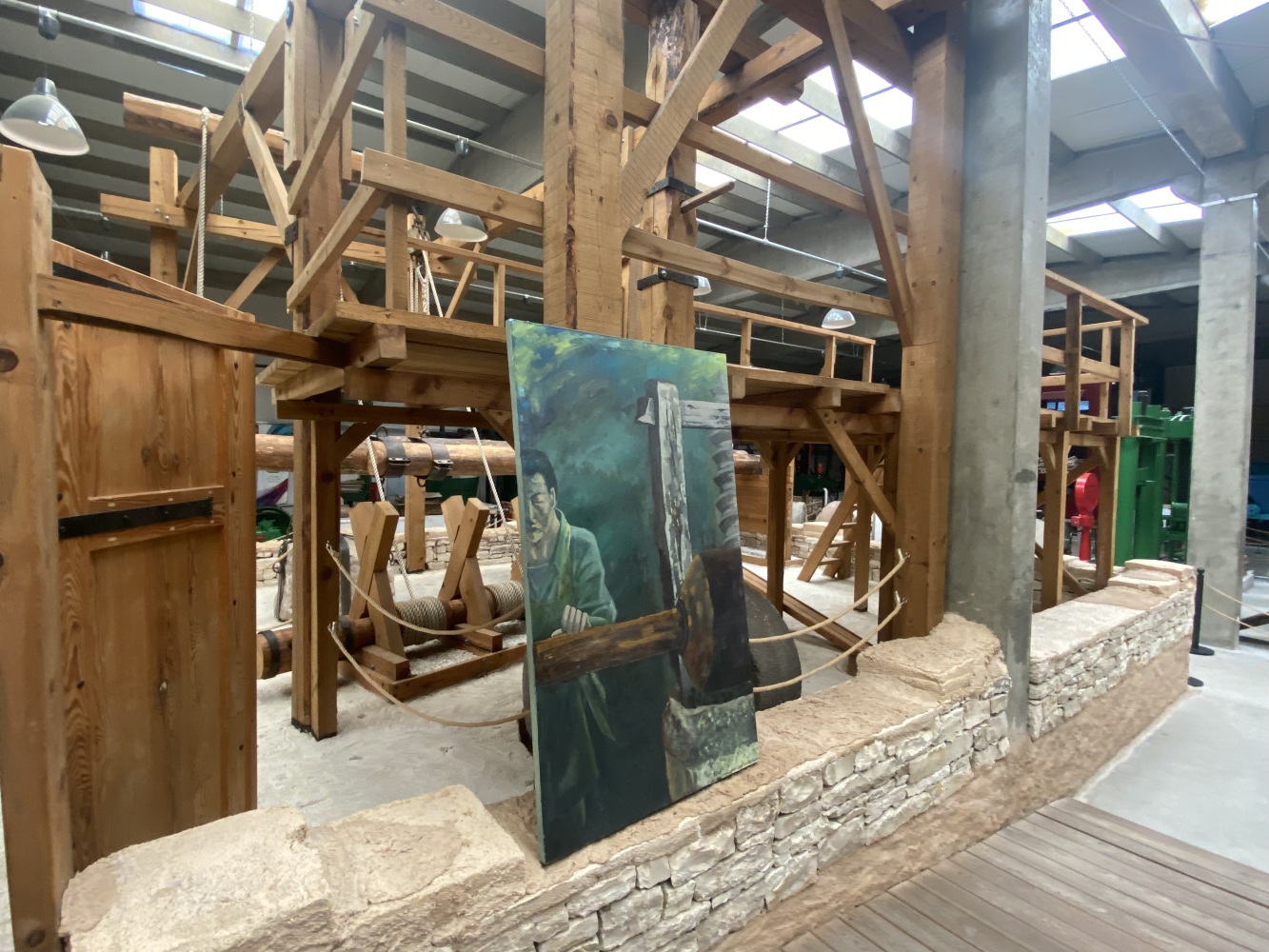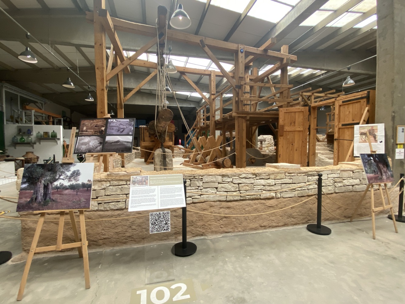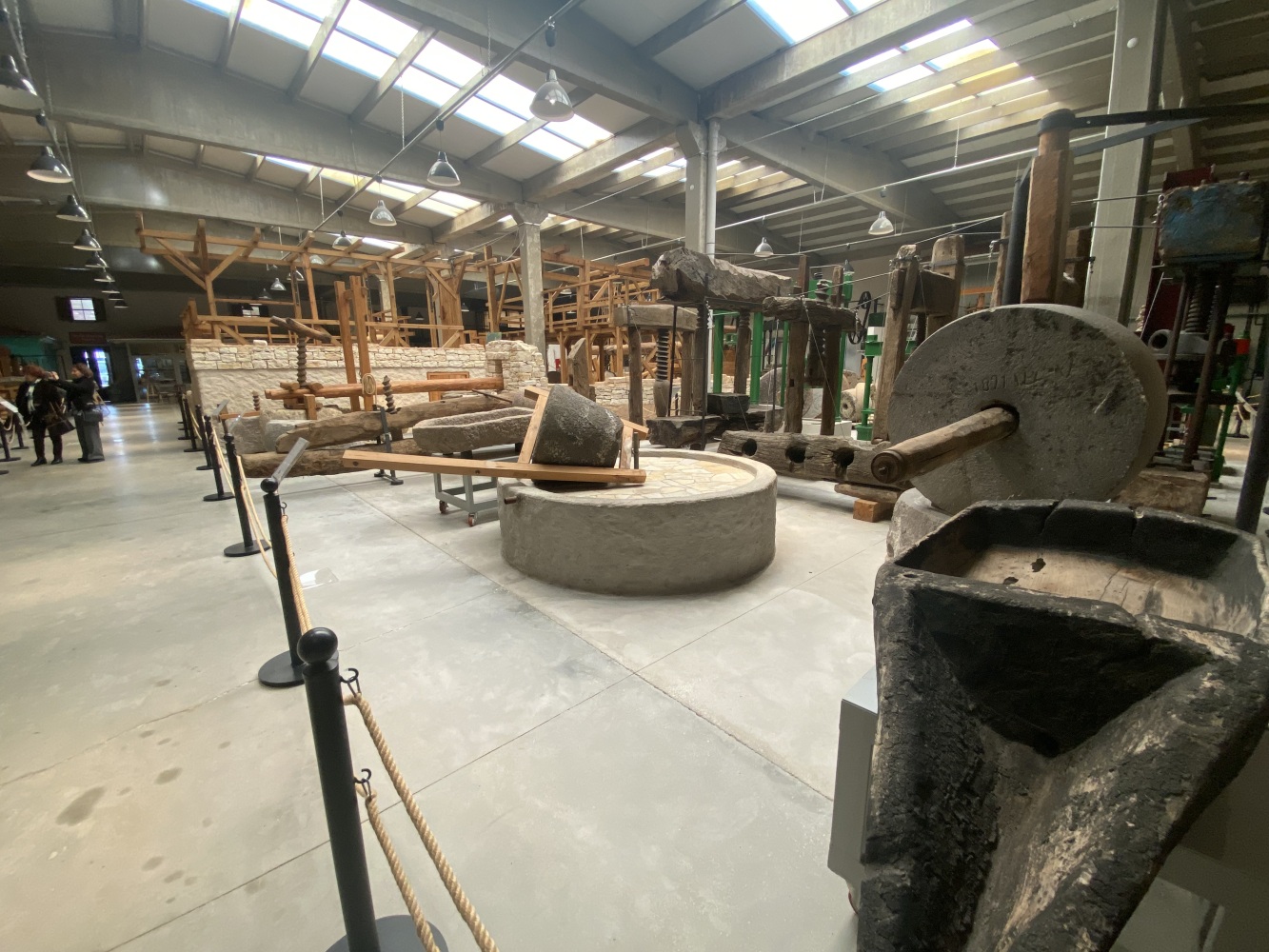 Gördüğünüz tüm mekanizma insan gücüyle çalışırdı. İlk işlem, zeytinin hamur haline getirilmesiiydi. Ahşap balkonun altındaki büyük ezme taşları, balkondaki kişiler tarafından döndürülür ve taşların altındaki zeytinler bu şekilde ezilirdi.