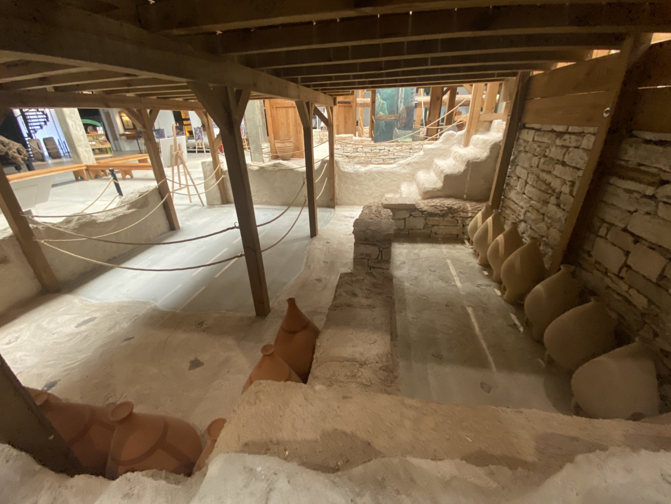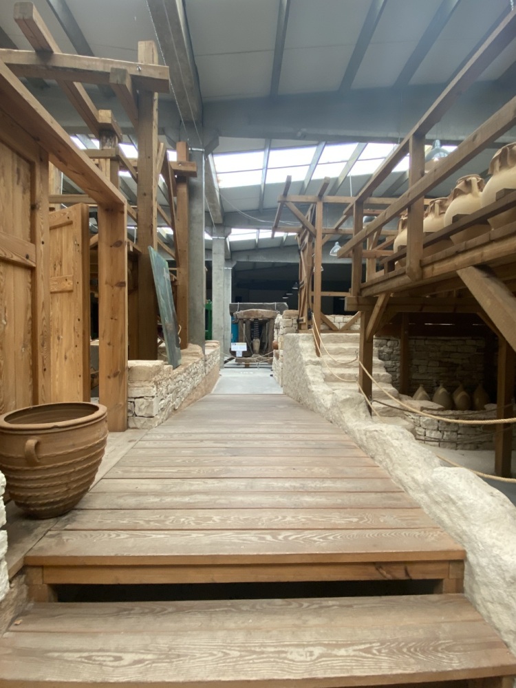 Klazomenai kazılarında ortaya çıkarılan işlikte bir depo bölümü bulunur. Karşınızda gördüğünüz, orijinal işlik de aslen yeraltında bulunan bir deponun kopyasıdır. Bu işlikler, dönemin yüksek hacimli üretim tesisleridir. Zeytinyağını uzun süreli saklamak için “pithos” adı verilen büyük küpler, taşımak içinse daha küçük hacimli amforalar kullanılırdı. Hepsi mutlaka yer altında, serin ve karanlık bir ortamda saklanırdı.
