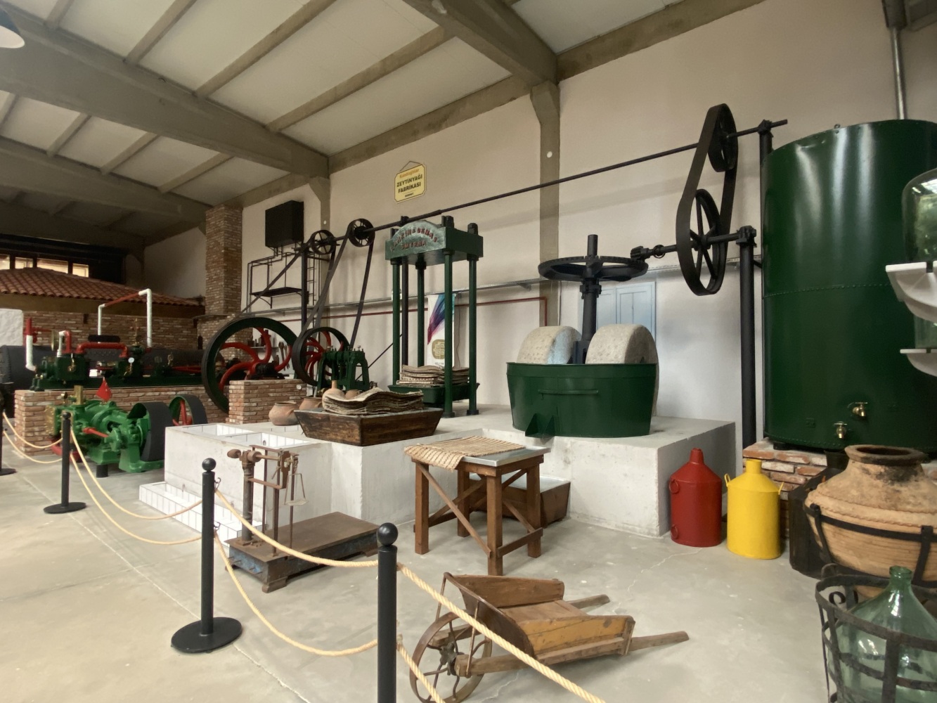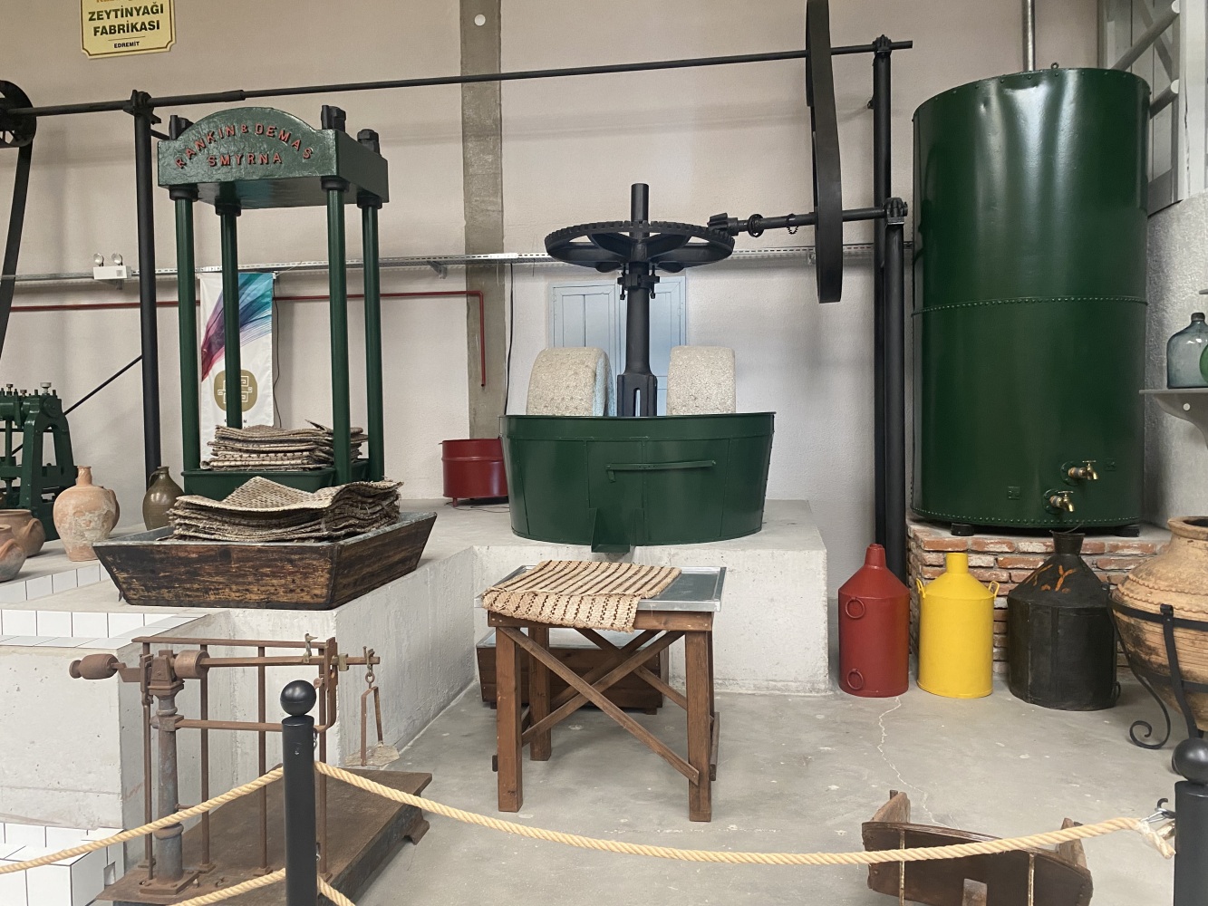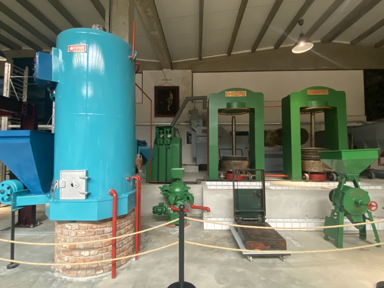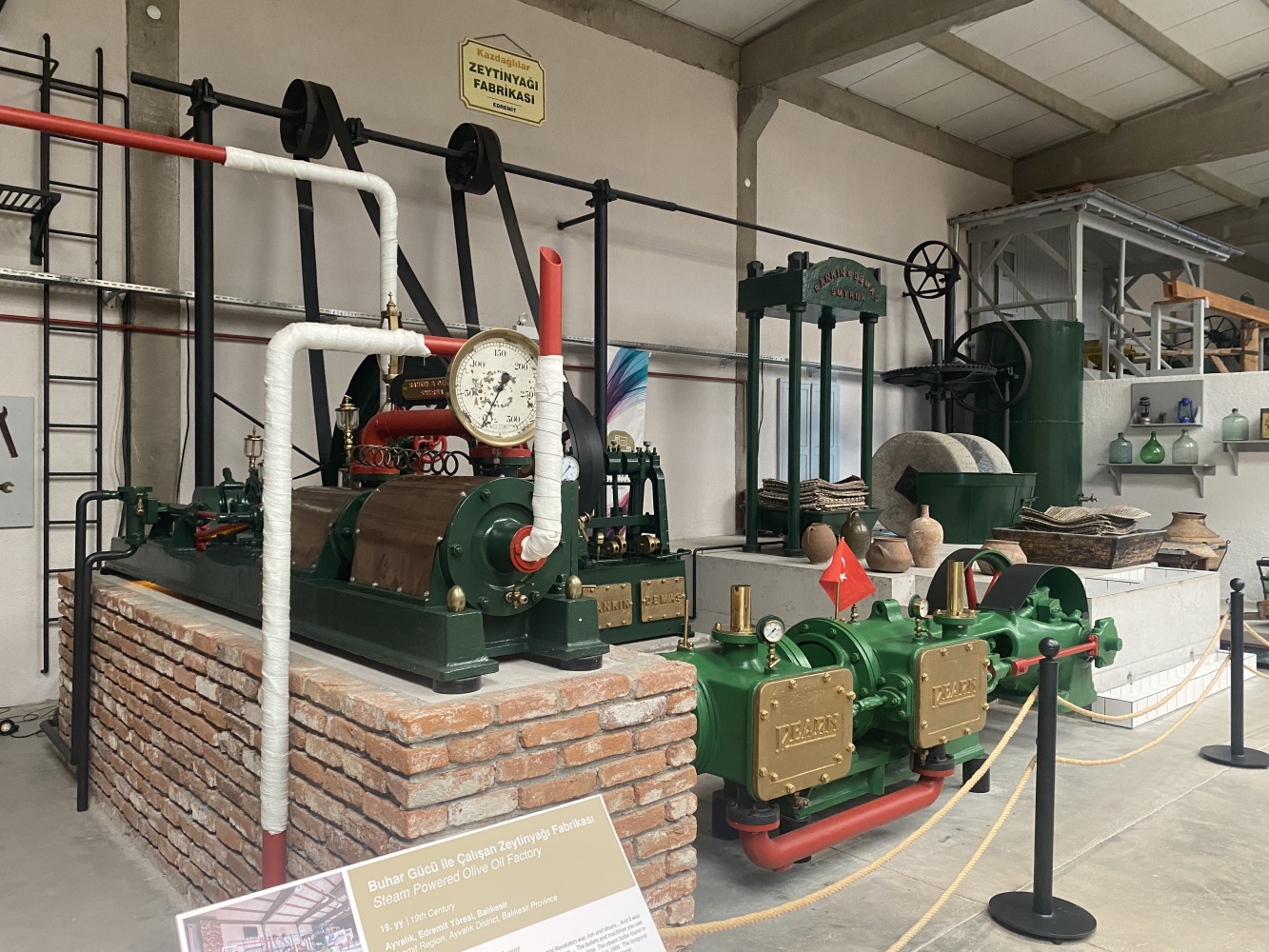 Cumhuriyetin ilk yılları hem savaşın yaralarının sarıldığı hem de ekonomik kalkınma hamlelerinin hayata geçirilmeye çalışıldığı bir dönemdir. Sanayi ve ticaret alanında boşalan yerleri Türk girişimciler doldurmaya başlamıştır. Bununla birlikte dönemin imkansızlıkları ve sermaye eksiklikleri de pratik çözümler gerektirmiyor değildir. Örneğin, burada gördüğümüz sistem aslen buğday öğütmek için kullanmaktaydı. Öyleyse bu sistem neden zeytinyagı üretim müzesi’nde yer almaktadır?