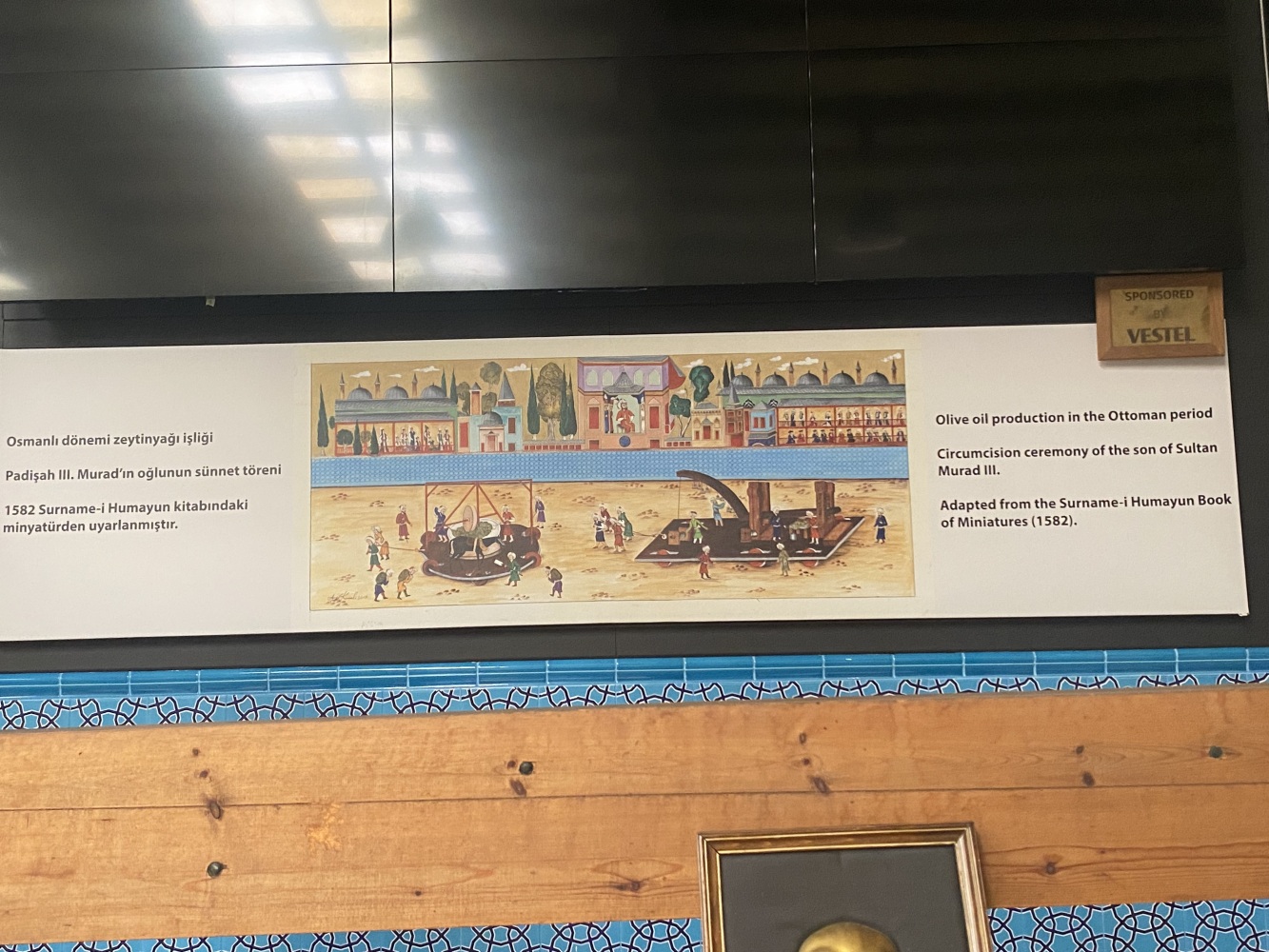 Bu minyatür, 1582 tarihli “Surname” isimli kitaptan alınmıştır. 1574-1595 arasında tahta kalan III. Murat’ın oğullarından birinin sünnet törenindeki bir sahneyi tasvir etmektedir. Törende farklı zanaatlarla uğraşan esnaf gruplarının padişahın önünden geçişi görünür. Bu esnaf gruplarından birisi de dönemin zeytinyağı üreticileridir. Seyyar işliğin de muhtemelen gösteri amaçlı yapıldığını düşünmekteyiz.