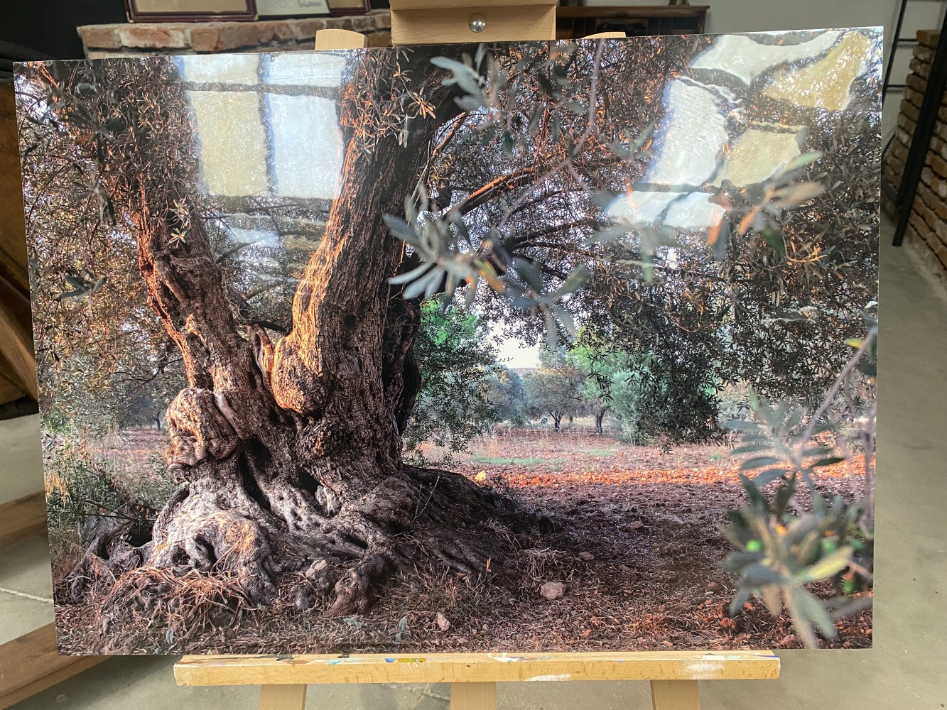 Sonraki aşama ise zeytin hamurunun sıkılmasıdır. Hamur, keçi kılından yapılmış yuvarlak ve yassı torbalara doldurulurdu. Sonra solda, kütüklerin altında gördüğünüz baskı tezgahına üst üste dizilirdi. Orta kısımdaki iplerin sarılı olduğu ahşap vinç (bocurgat), ‘baskı kolu’ işlevi gören kütüklere makaralarla bağlıdır. Bu sistem yardımıyla kütüklerin bize yakın uçları aşağı doğru çekilir, baskı kolu aşağı indikçe tezgahtaki torbalara basınç uygulayarak hamurdaki yağlı suyun çıkması sağlanırdı.