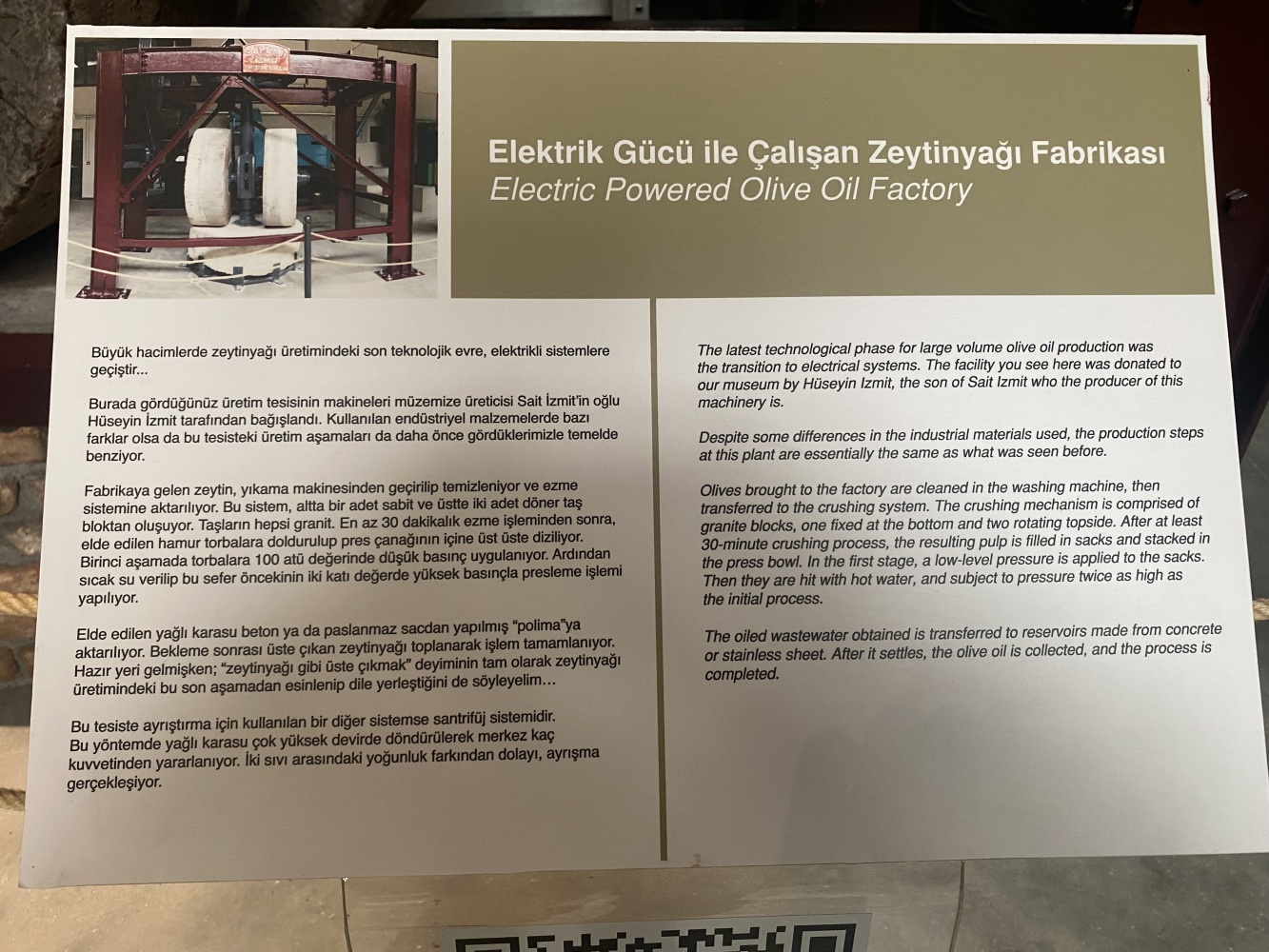 Bu üç aşamalı işlem binlerce yıl boyunca sadece kas gücü ile yapılmıştır. Önce insanların, sonra da hayvanların kas gücüyle… Bu işlik, Urla‘ın Zeytineli Köyü’nde Hatipoğlu Hüseyin’e ait olan zeytinyagı değirmenlerinin bir canlandırmasıdır. Kuruluş tarihi ise 1875’dir. O tarihte sanayi devrimi tüm dünyada makineleşmeyi hızla artırmış olsa da zeytin coğrafyasındaki küçük ölçekli işletmelerin hala insan ve hayvan gücüne bağımlı olduğunu hatırlayalım…