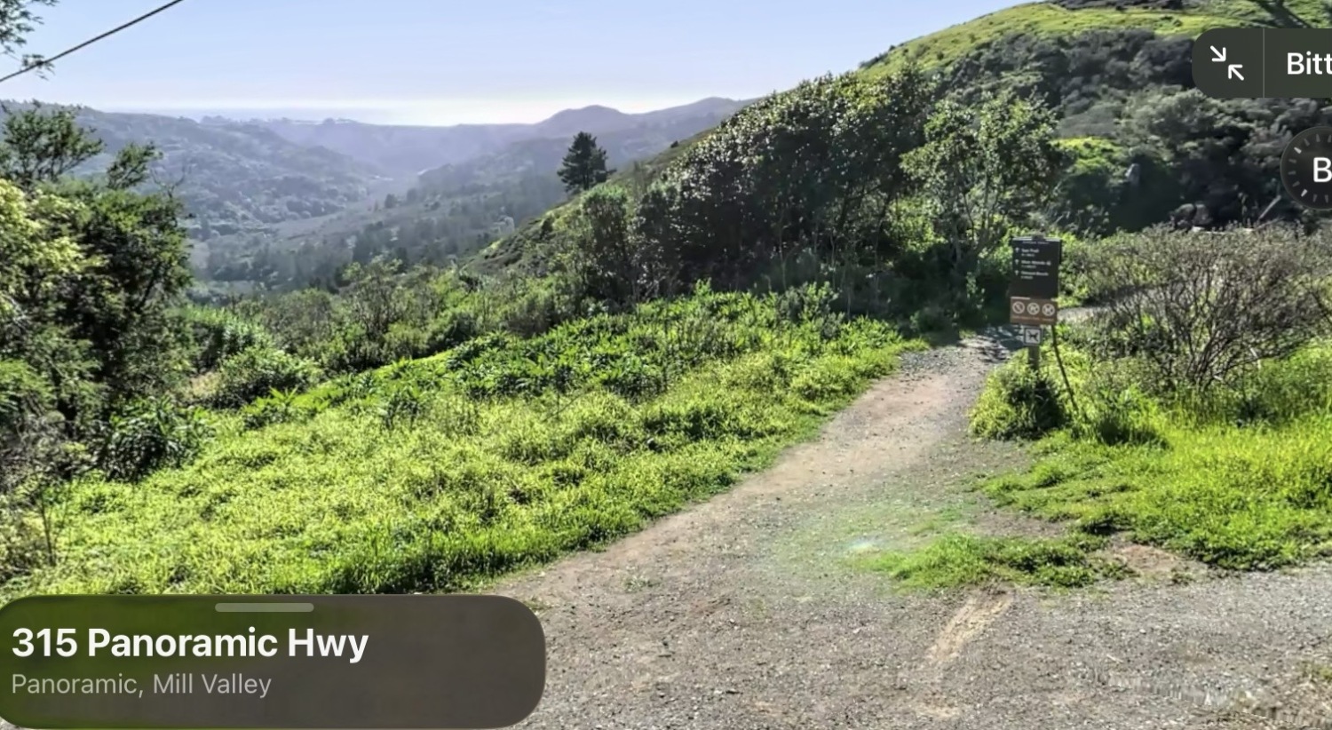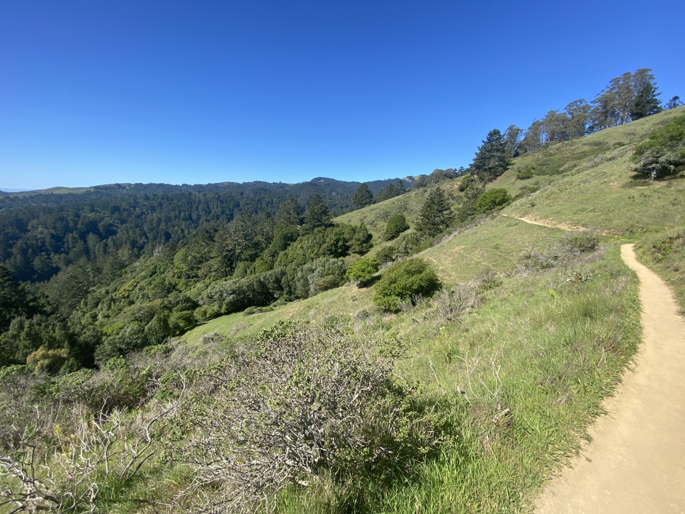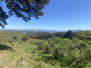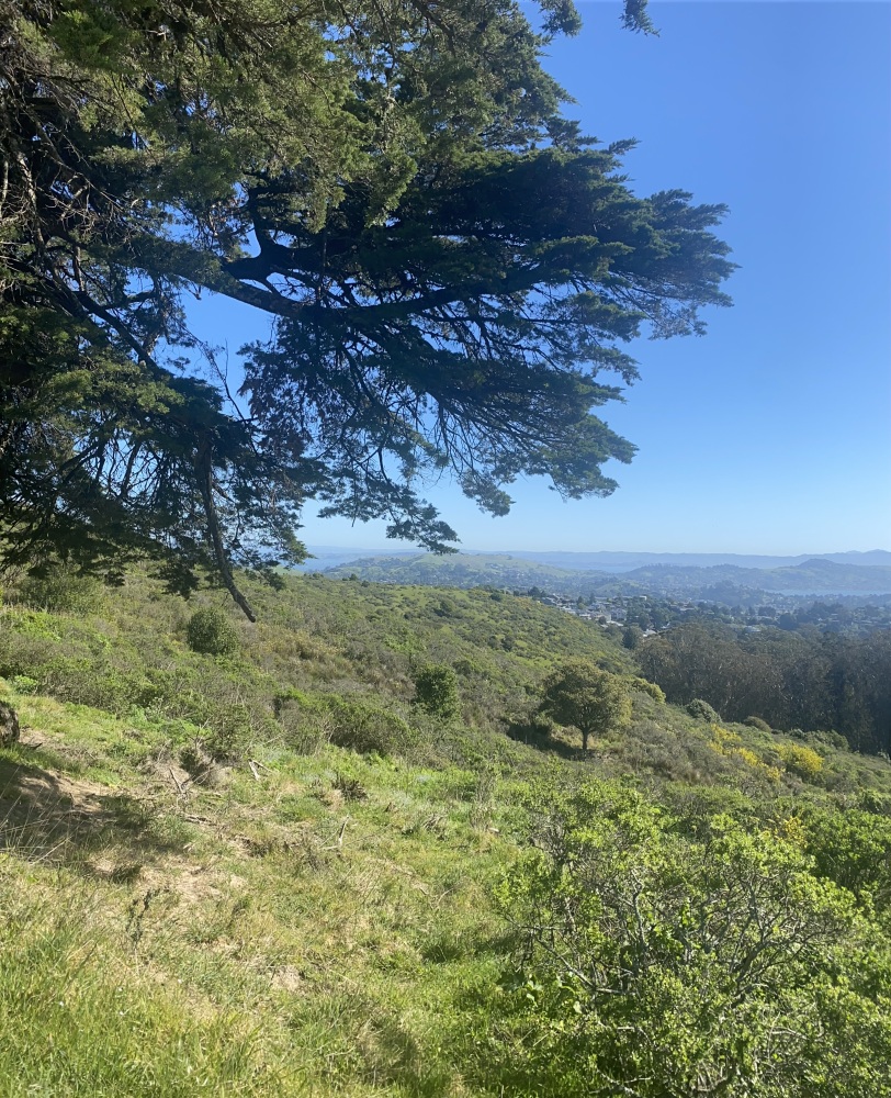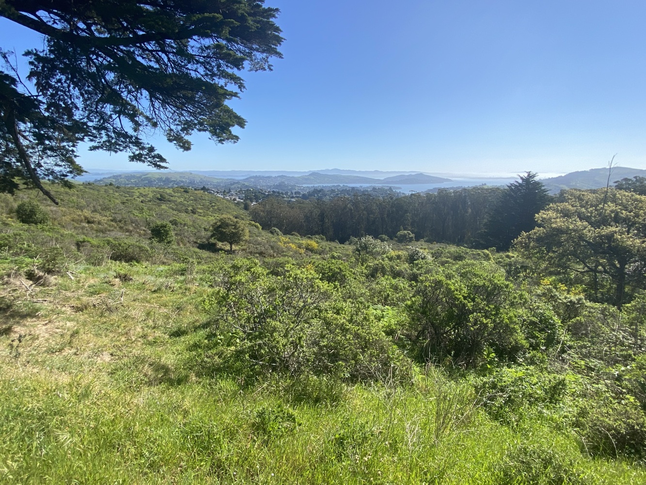 Muir Woods yolunda Dias Ridge patikası giriş mevkiinden San Francisco panoramik manzarası. Soldan itlbaren San Francisco Körfezi, Richmond Köprüsü, Tiburon, Angel Island ve sağda Sousalito kıyıları ile en sağda uzakta Golden Gate Köprüsü. Çıplak gözle bu ayrıntılar çok daha güzel gözüküyor kuşkusuz.